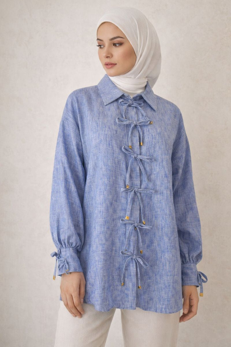 Bluse mit Tie-Front und Ärmelschleife - Blau