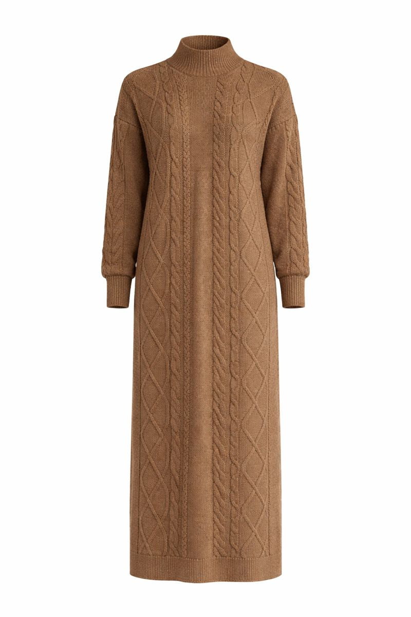 Dieses Strickkleid ist ideal für die kalte Jahreszeit. Das Material ist warm, bequem und angenehm zu tragen. Ein weibliches Kleidungsstück, das zudem mit einem schönen Zopfmuster verziert ist.