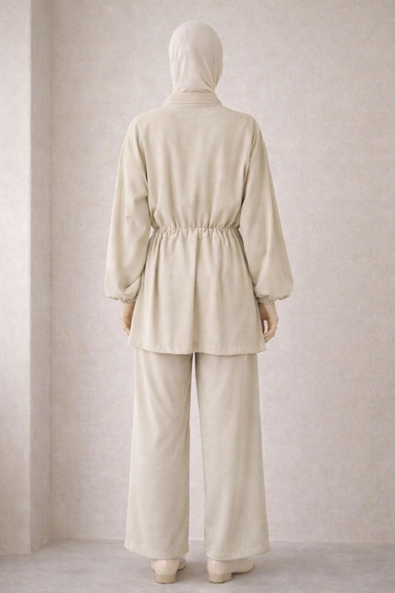 Zweiteiliges Set mit Ballonärmel und Taillengürtel - Beige