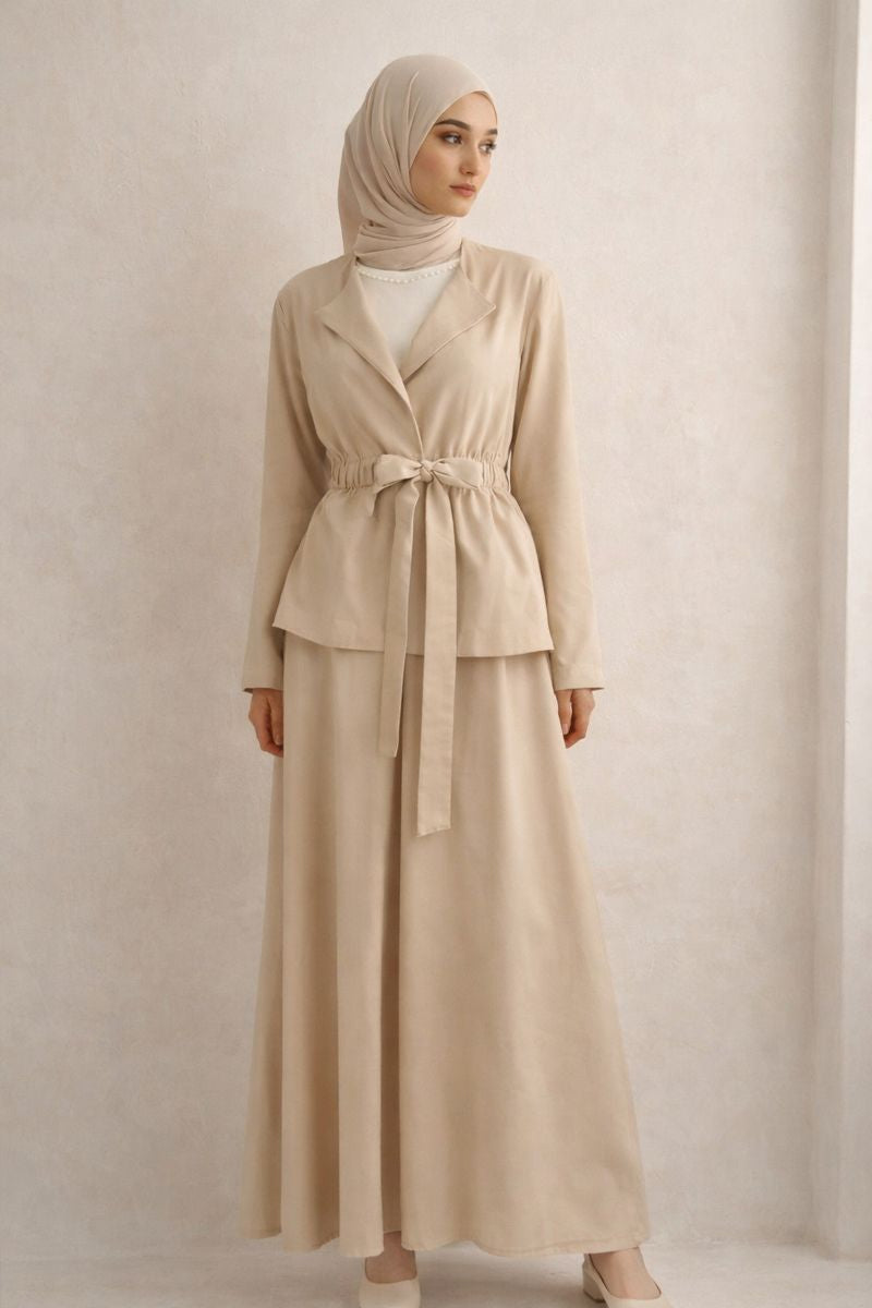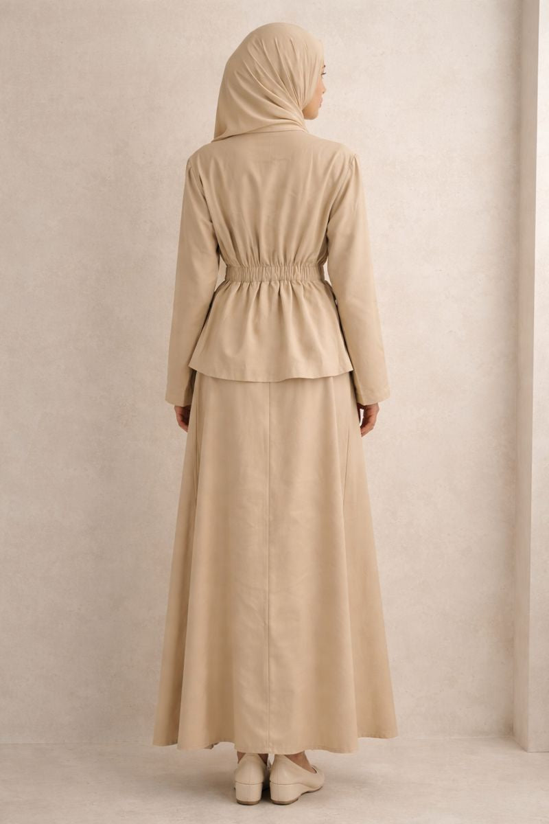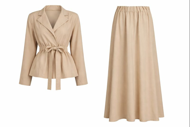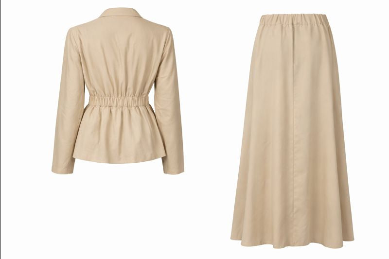 Das Set besteht aus einem eleganten Oberteil mit V-Neck mit elastischem Taillengürtel und einem Maxirock. Beide Set-Bestandteile bestehen aus Tencel-Stoff, der besonders atmungsaktiv, geschmeidig und schwerelos ist. Der Rock zeigt eine ausladende Form und sorgt für eine wunderschön feminine Silhouette, die jedem Figurtyp schmeichelt. Erstklassiger Tragekomfort ist hier kombiniert mit weiblicher Eleganz. Das Set eignet sich sowohl für festliche Anlässe als auch für Shopping-Dates mit Freundinnen.