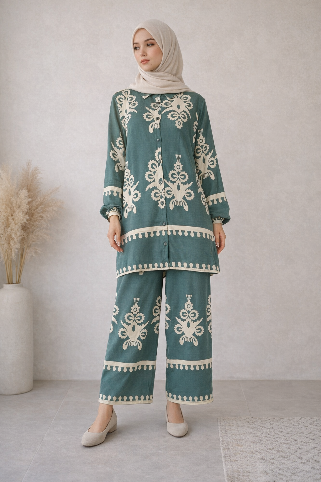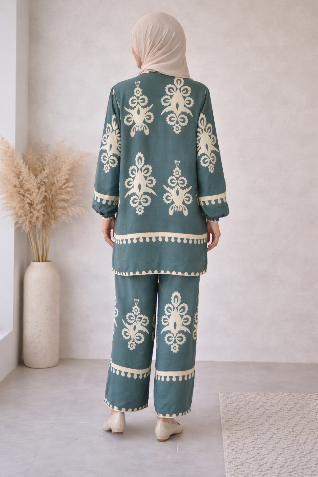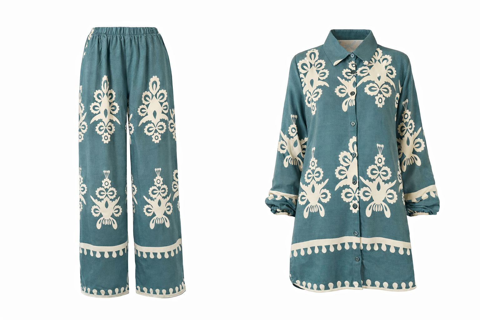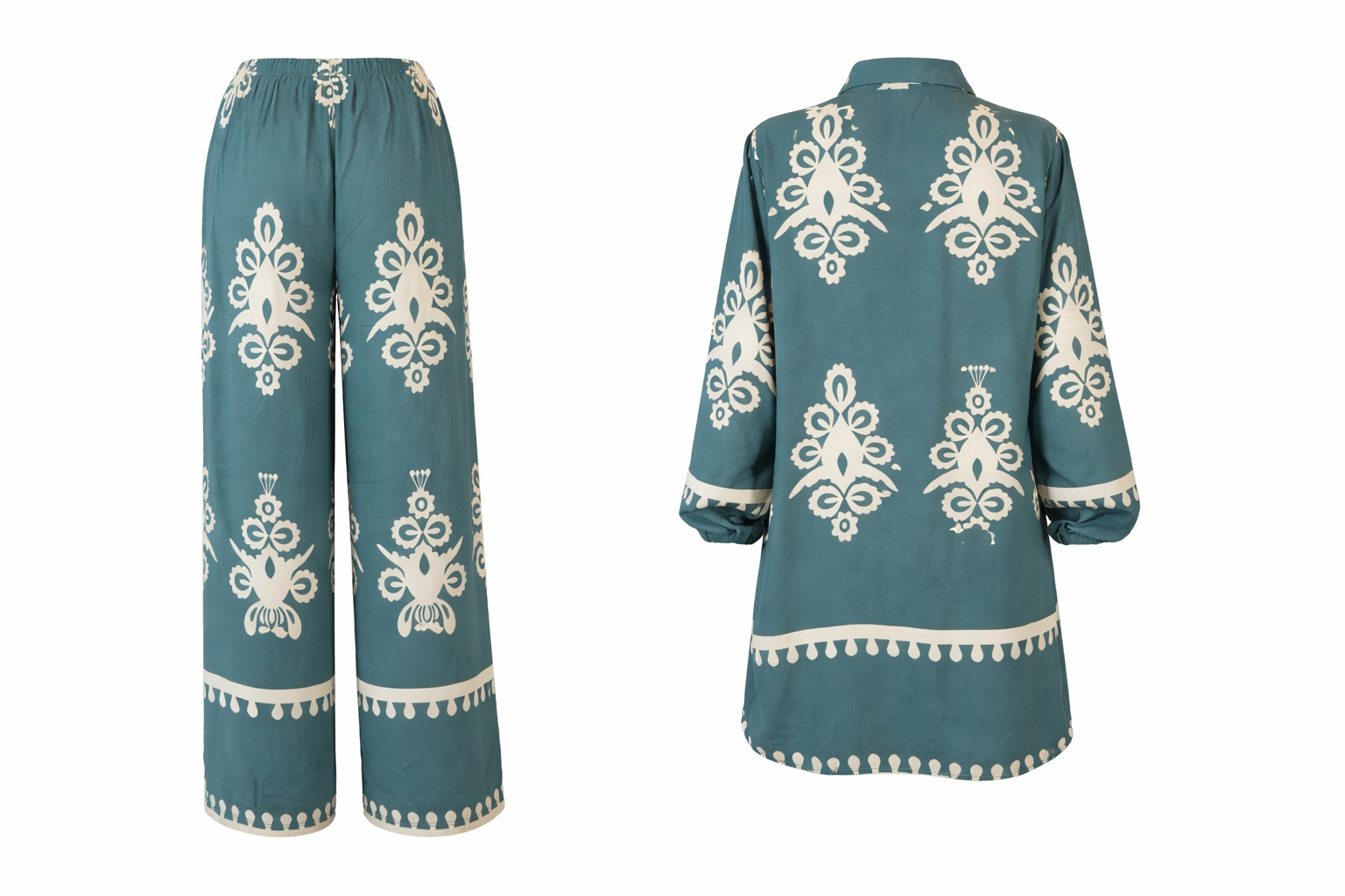 Das Set besteht aus einer Bluse mit künsterlisch-stilvollem Muster und einer Hose mit elastischem Hosenbund mit weitem Beinschnitt. Beide Bestandteile bestehen aus Viskose und fühlen sich geschmeidig und und sanft auf der Haut an. Das aufgedruckte Muster ist ein absoluter Hingucker und beeindruckt bei jedem Anlass.